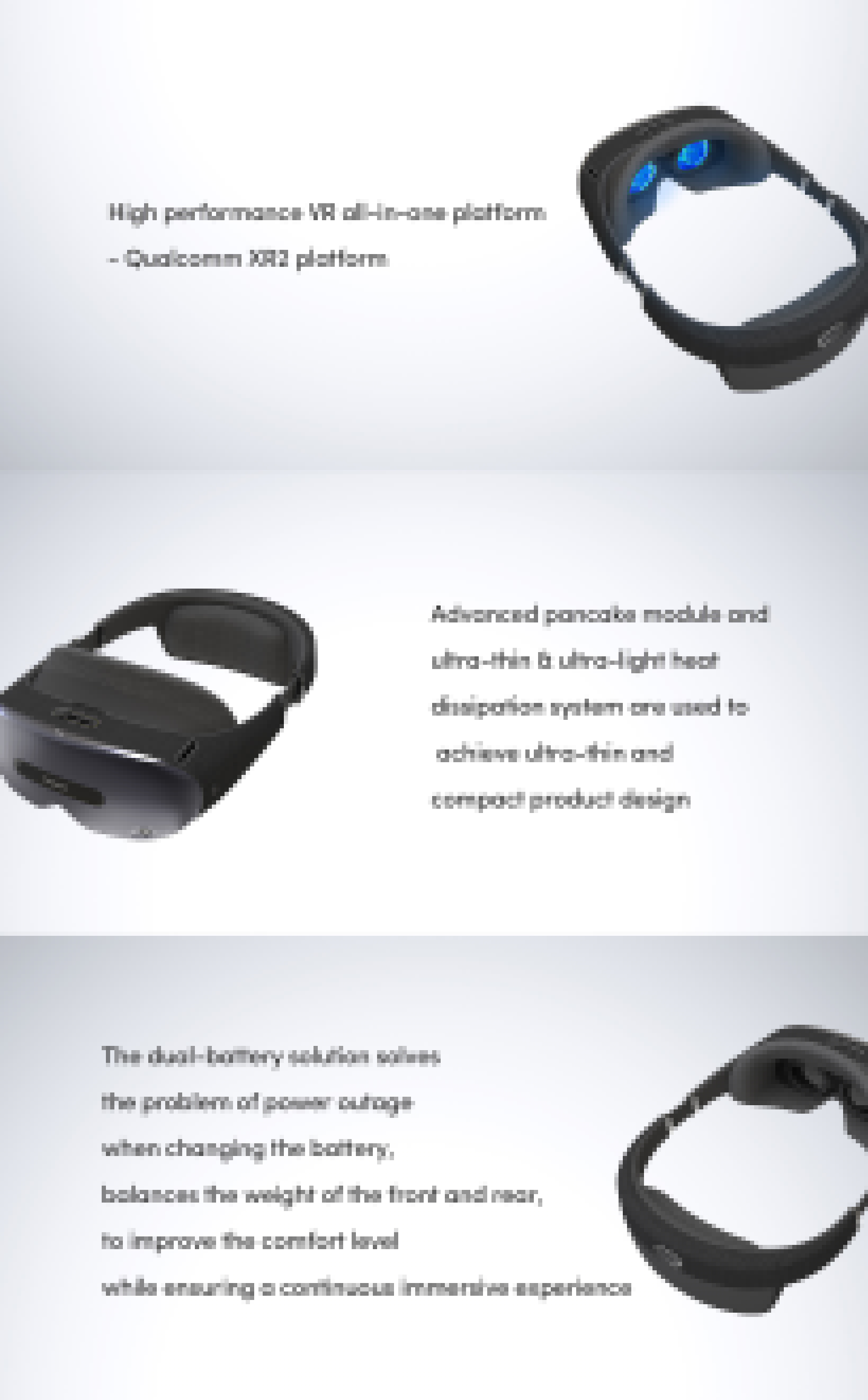 ? Advanced pancake module and ultra-thin & ultra-light heat dissipation system are used to achieve ultra-thin and compact product design ? IPD adjustment, myopia adjustment and 6DoF tracking, eye tracking , see-through and other modular technology solutions ? Near ear acoustics ensures comfort while reducing sound leakage ? The dual-battery solution solves the problem of power outage when changing the battery to improve the comfort level while ensuring a continuous immersive experience